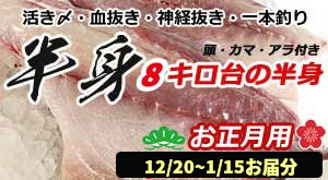 寒ブリ通販、寒ぶり8キロ台の 天然ブリ、一本釣りの寒ぶり8k台を半身で 活き締め、血抜き、神経抜きの高級寒ぶり カシラ・カマ・アラ、身頃1枚 の半身販売 12/20〜1/15届け分 |