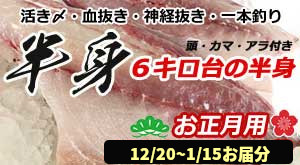 寒ブリ通販、寒ぶり5キロ台の 半身販売(カマ・アラ付き) 税込・送料別15,000円 天然ブリ、一本釣りの寒ぶり5k台を半身で 活き締め、血抜き、神経抜きの高級寒ぶり カシラ・カマ・アラ、身頃1枚 の半身販売 12/20〜1/15届け分 |